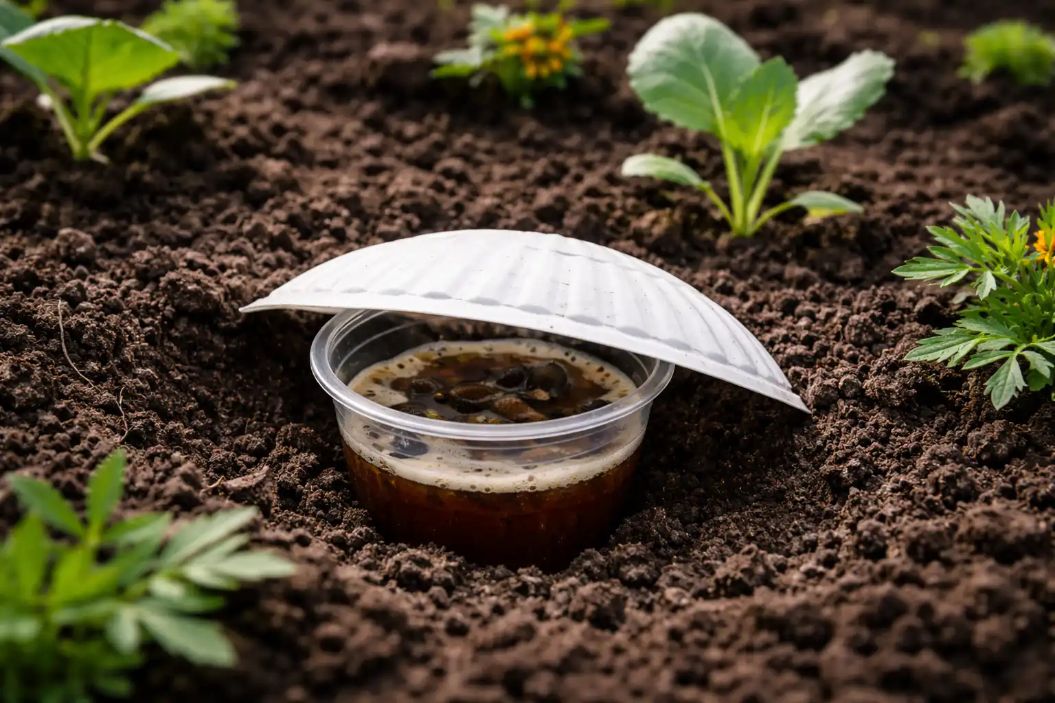 • Kasti mažus plastikinius puodelius lygiai su žeme. • Užpildykite juos trečdaliu tamsaus alaus arba vandens, mielių ir cukraus mišinio. • Uždenkite viršų puse vienkartinės lėkštės, kad nepatektų lietus. • Kiekvieną rytą patikrinkite ir išvalykite konteinerius.