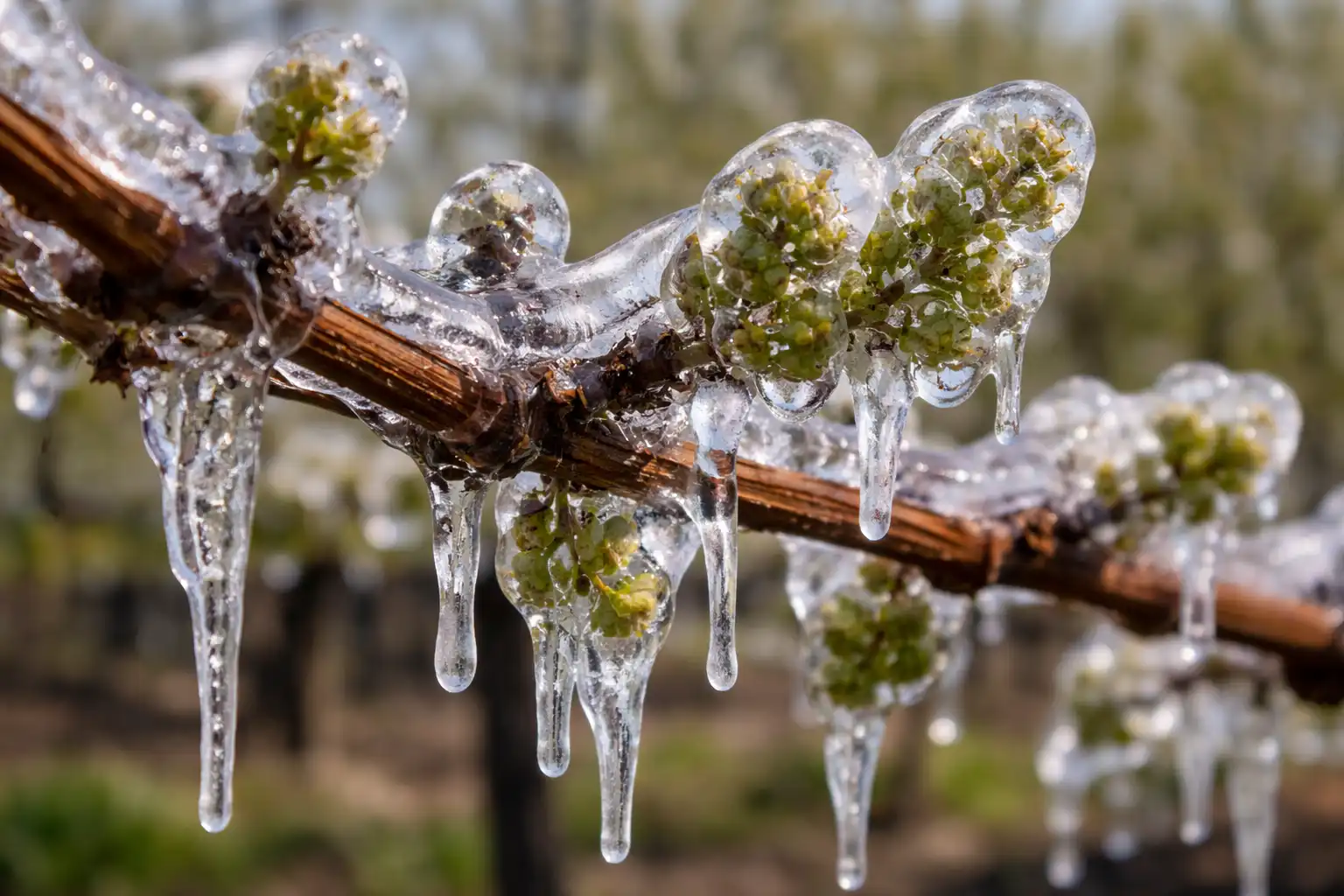 Pagrindinė uogų trūkumo priežastis – žala centrinis inkstas. Vynuogės gali išauginti pakaitinius pumpurus, tačiau dažniausiai jie yra sterilūs. Kad to išvengčiau, naudoju „ledo lukšto“ metodą arba krioprotekcinis drėkinimas. Idėja yra priversti vandenį užšalti ant vynmedžio, išleidžiant latentinę šilumos energiją, kuri neleidžia viduje esantiems audiniams atvėsti iki kritinio taško.