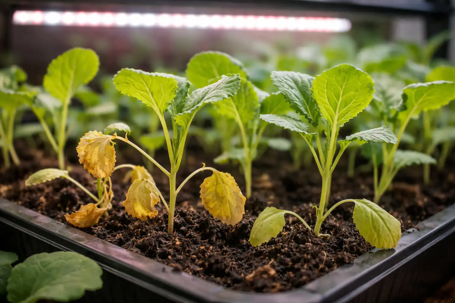 Kai sodinukai stovi ant šiaurinio lango arba kambario gale, jie išleidžia visus išteklius ieško šviesos šaltinio. Dėl to audiniai plonėja, o net šiek tiek pakilus temperatūrai patalpoje drėgmė išgaruoja greičiau, nei šaknys gali ją išpumpuoti. Tai yra tiesioginis kelias į visos sodinamosios medžiagos partijos mirtį.