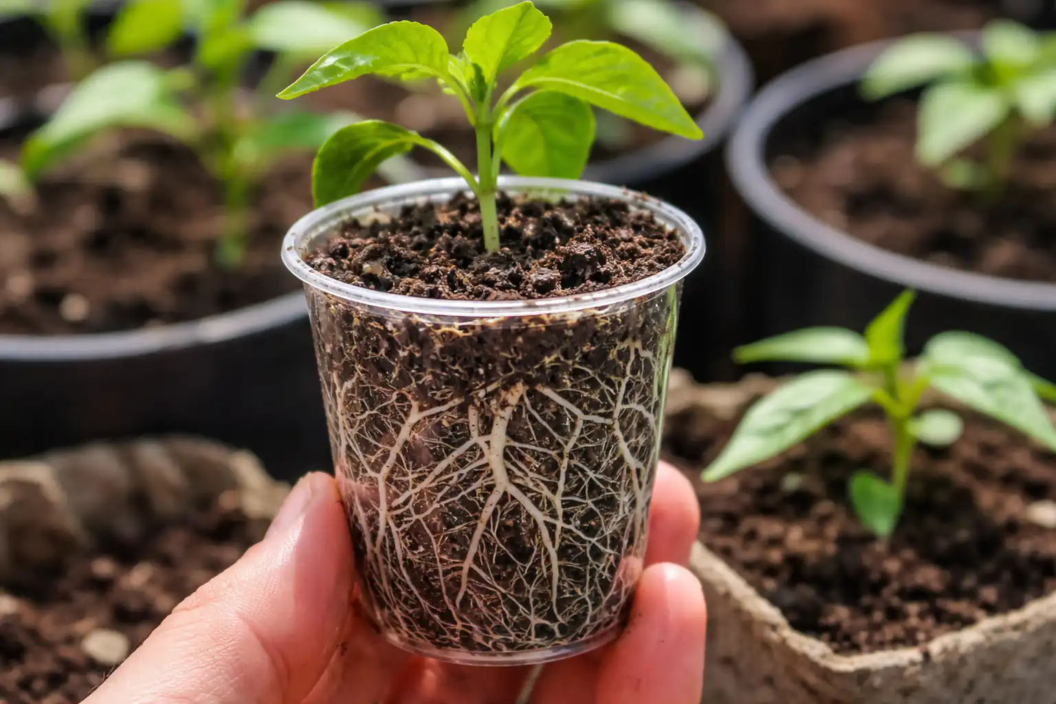Kai pipirų šaknis pajunta konteinerio ribas, ji pradeda aktyviai šakotis, sudarydama tankų siurbiamų plaukų gumulą. Dideliame tūryje šaknis „prarandama“, patenka į vieną ilgą siūlą, o neišsivysčiusi žemė sustingsta ir atima augalui deguonį.