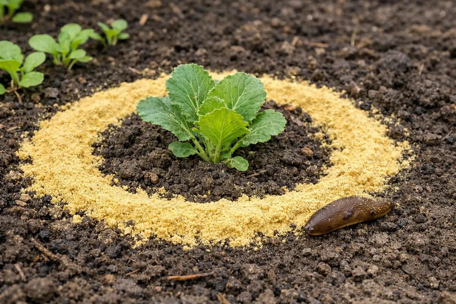 Išsklaidyti garstyčių milteliai tankus bent penkių centimetrų pločio žiedas aplink kiekvieną augalą.