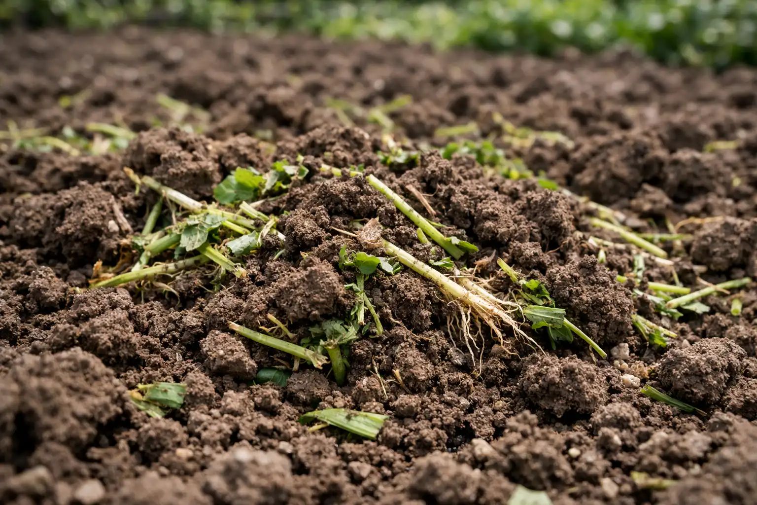 Pakanka poros centimetrų gylyje plokščia pjaustytuvu nupjauti šaknis ir palikti žalumynus ant paviršiaus arba lengvai sumaišyti su viršutiniu sluoksniu.