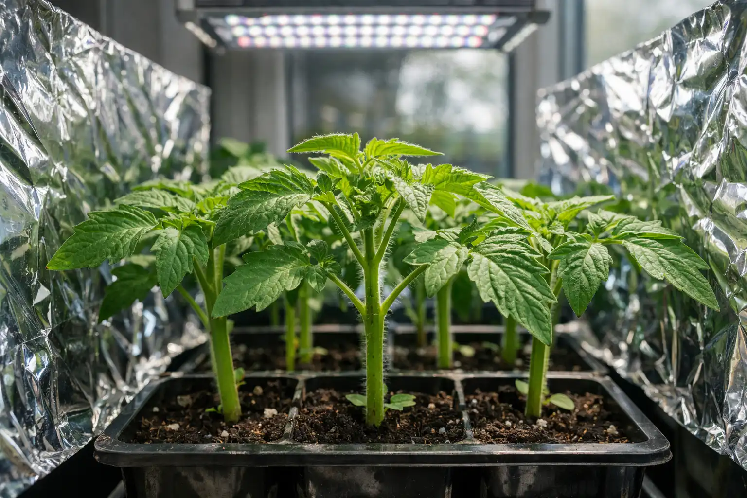 Naudojant folijos atšvaitus sodinukų šonuose, apšvietimas padidėja 30%.