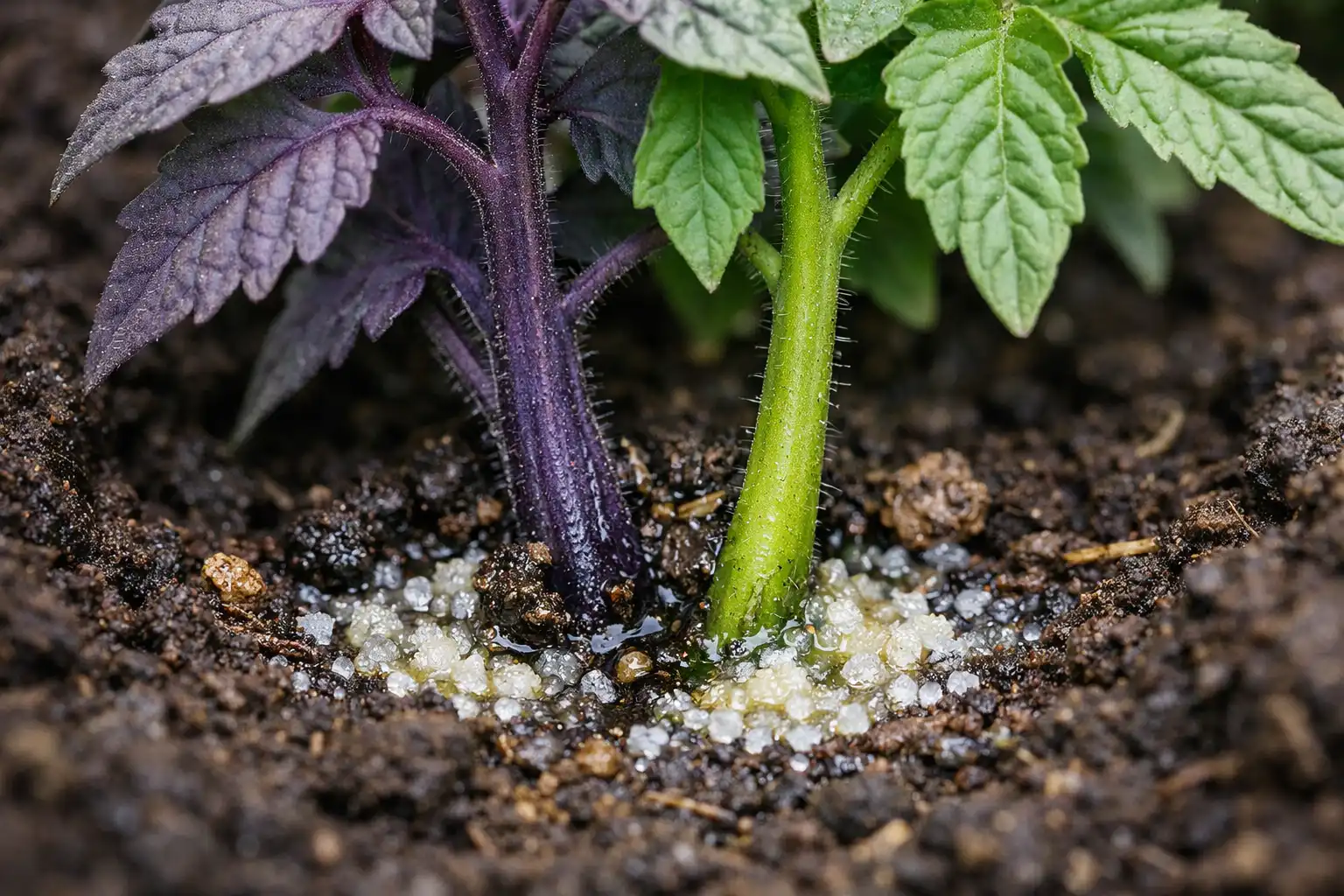 Kai dirvožemio temperatūra nukrenta žemiau 14°Cpomidorų šaknų sistema praktiškai nustoja įsisavinti fosforo. Net jei dirvoje šio elemento perteklius, šaltoje dirvoje jis virsta augalui neprieinama forma. Dėl to audiniuose kaupiasi antocianinai – pigmentai, suteikiantys tą pačią mėlynai violetinę spalvą. Tai apsauginė reakcija į šalčio ir šviesos stresą.