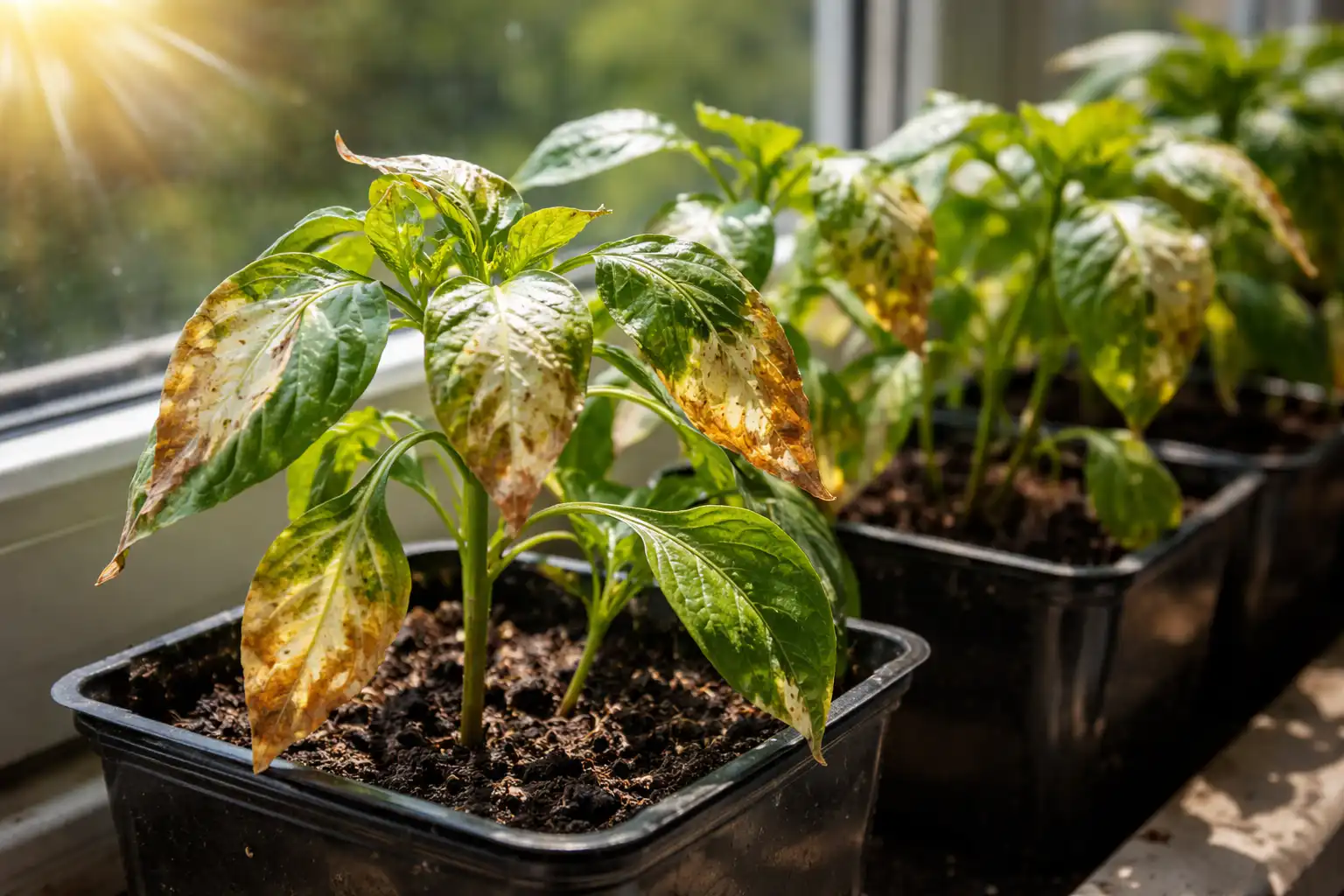 Pagrindinės spąstai slypi tame, kad pavasario saulė yra apgaulinga. Stiklas ant lango veikia kaip padidinamasis stiklas, sutelkdamas spindulius fotosintetiniai audiniai. Ypač nukenčia paprikos, kurios anksčiau augo po fitolampais arba debesuotu oru: jų ląstelės nespėjo sukurti apsauginių pigmentų.