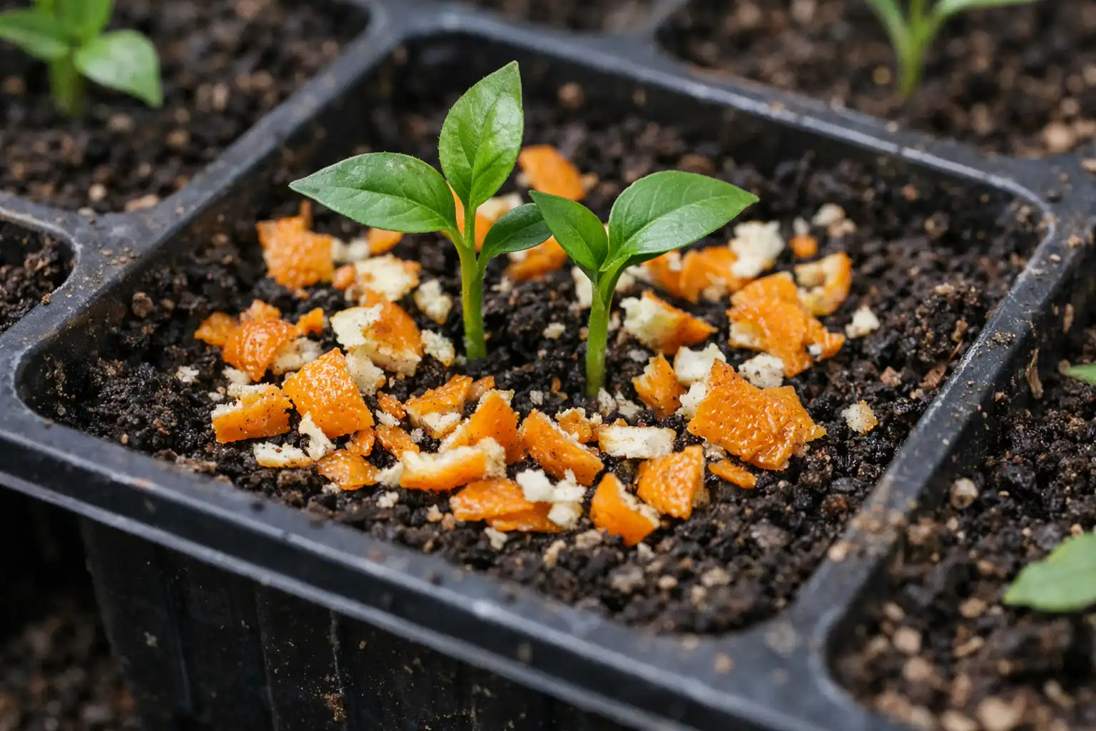 Be mitybos, šiek tiek apelsinų trąšų rūgština dirvąkuris idealiai tinka pomidorams, paprikoms ir daugumai sodo gėlių. Eteriniai aliejai sukuria nematomą barjerą žemės paviršiuje, pro kurį negali prasiskverbti grybelinių ligų, tokių kaip juodoji kojelė, sporos.