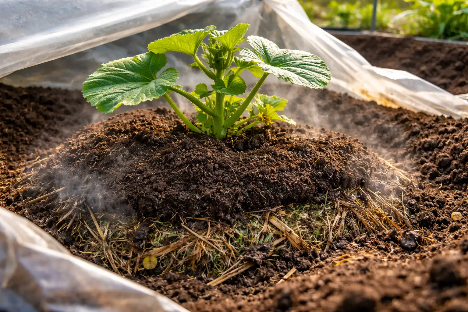 Kad moliūgas augtų staigiai, jam reikia „karštosios pradžios“. Rekomenduoju naudoti vietinio biokuro metodą. Likus savaitei iki sodinimo, iškasama kaip kastuvu gili duobė, į kurią įdedama ką tik nupjauta žolė arba pernykštis šienas, sumaišytas su kompostu.