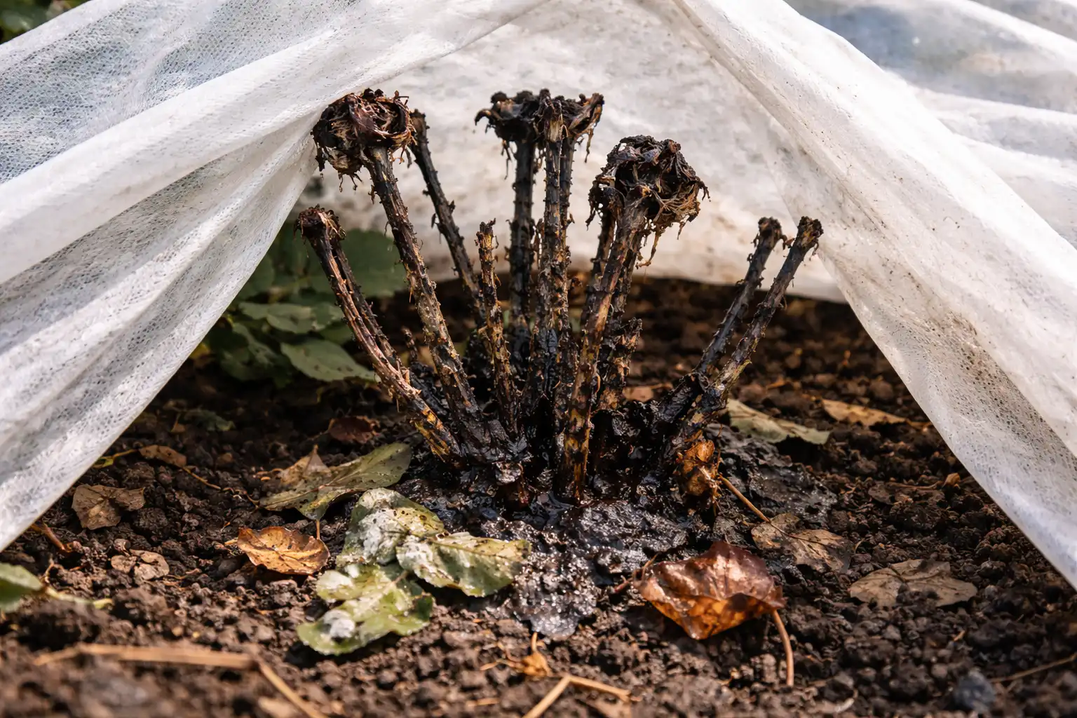 Kodėl po agropluoštu rožės juoduoja?