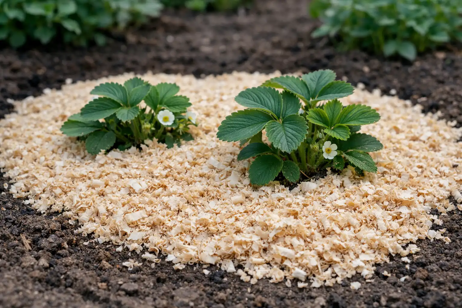 Puikiai tinka šviesios medienos pjuvenos atspindi saulės spinduliusneleidžiant perkaisti dirvožemiui per gegužės karščius.
