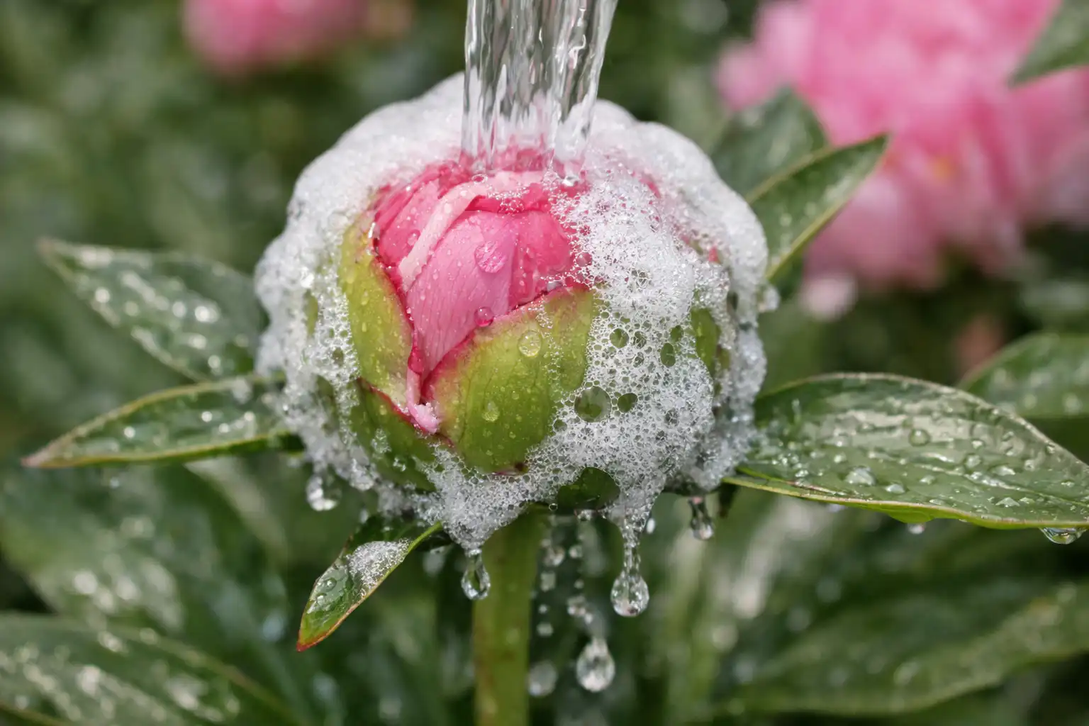Slaptas niuansas: niekada nenaudokite ledinio vandens iš šulinio purškimui. Norėdami paruošti kompoziciją, naudokite tik nusistovėjusį vandenį kambario temperatūroje, kad bijūnas nesukeltų temperatūros šoko.