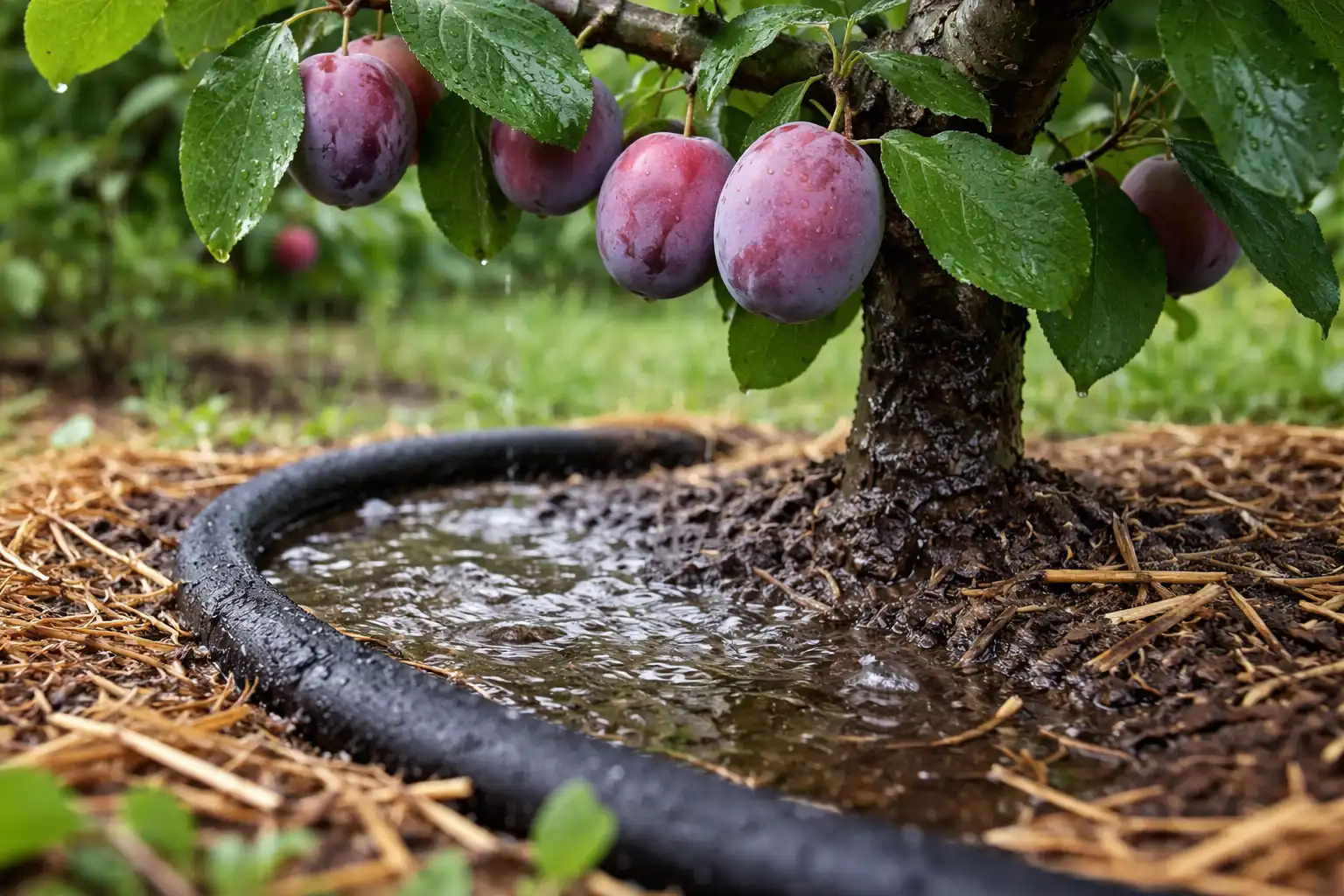 • Laistykite slyvą taip, kad žemė būtų drėgna bent iki 40–50 cm gylio. • Naudokite metodą pabarstymas karūnos vakaro valandomis, jei labai karšta. • Medžio kamieną būtinai mulčiuokite nupjauta žole ar šiaudais.