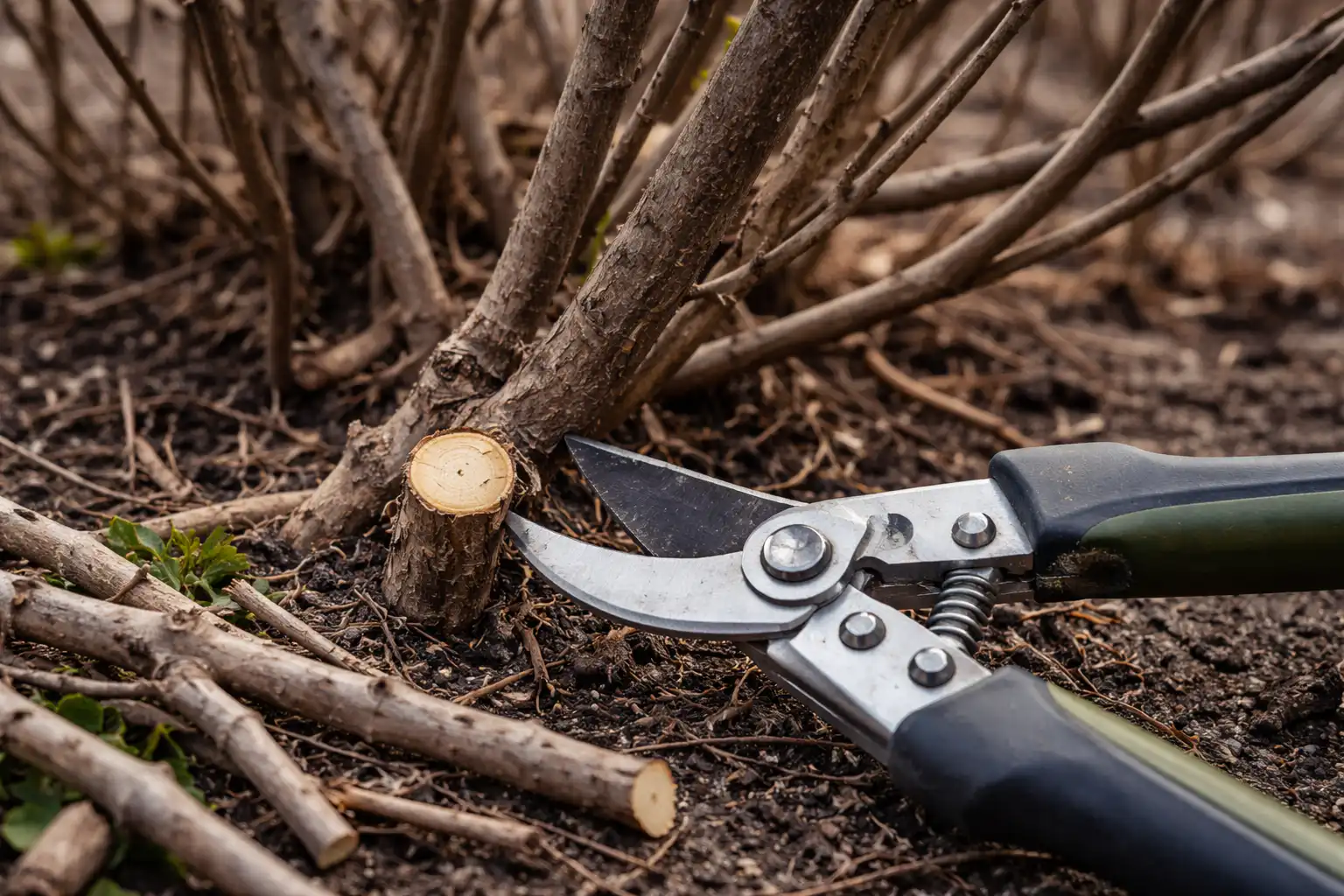 „Niekada nepalikite kelmų šalindami storas šakas. Nupjaukite „žiedą”, kad mediena tolygiai suveržtų. Kelmai dažnai pūva ir tampa kenkėjų namais, kurie vėliau sunaikina visą krūmą.”