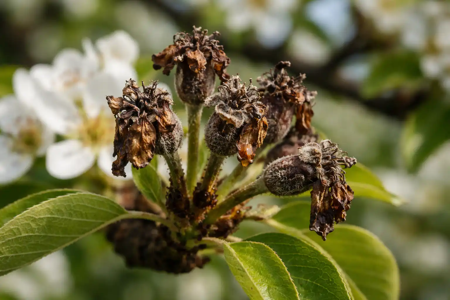 Jei medis atrodo apdegęs, o gėlės kabo kaip juodi skudurai, greičiausiai susidursite su tuo bakteriozė. Tai pavojinga liga, kurią platina vabzdžiai ir vėjas. Šiuo atveju įprasti fungicidai nepadės; reikalingas radikalesnis požiūris, naudojant specializuotus biologinius agentus.