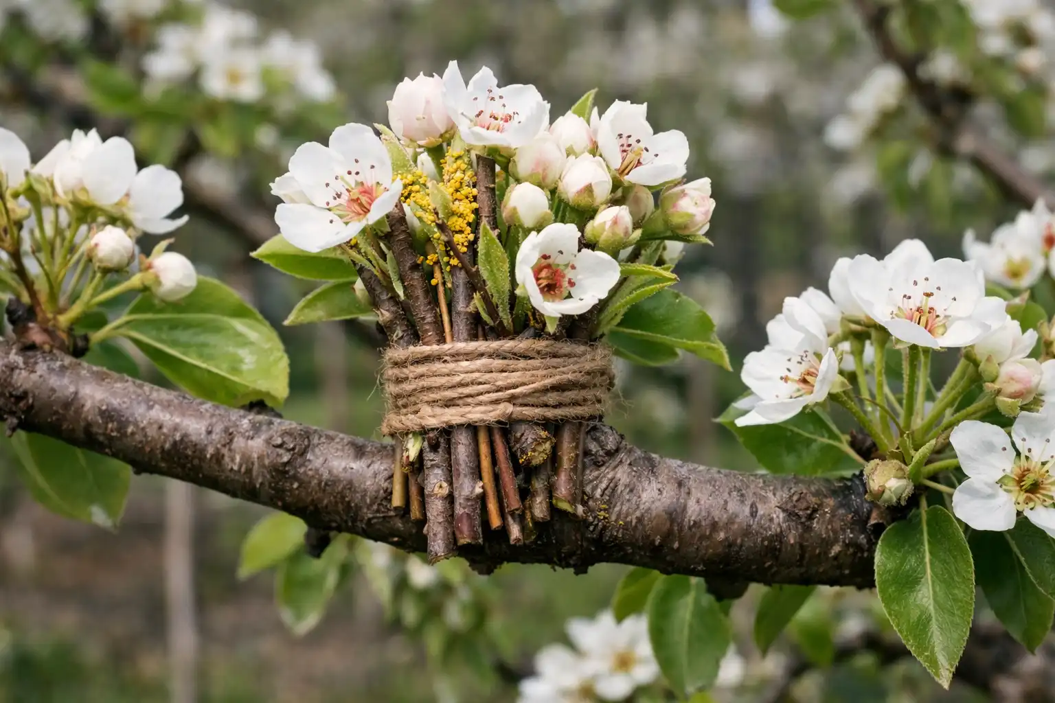 Tai mano mėgstamiausias gyvenimo įsilaužimas, kuris veikia 100% laiko. Jei neturite vietos antram medžiui, naudokite laikiną apdulkintoją. Idėja paprasta: kai jūsų kriaušė pradeda žydėti, reikia nupjauti kelias žydinčias skirtingos veislės šakas nuo kaimynų ar miške (laukinė kriaušė yra puiki žiedadulkių donoras).