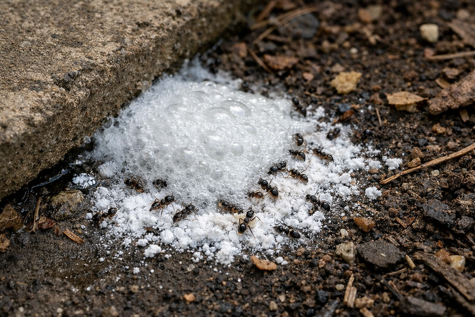 Jei atvirame lauke radote didelį lizdą, galite naudoti galingą reakciją neutralizavimas. Pirmiausia užpildykite skylutes kepimo soda, o tada užpildykite jas actu. Susidariusios putos prasiskverbs į giliausius skruzdėlyno kanalus, padengdamos tas vietas, kur įprasti milteliai nepasiekia.