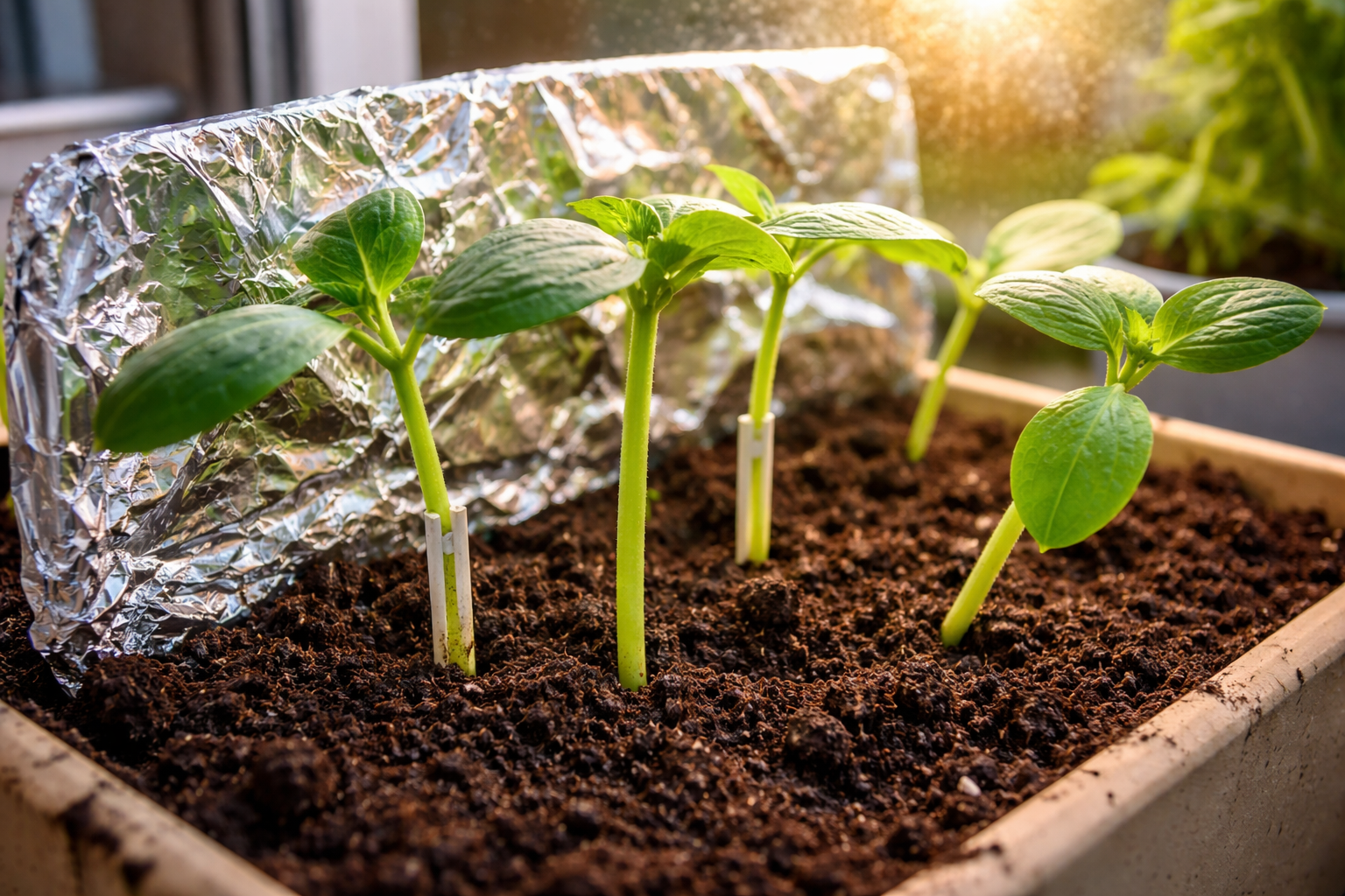 Už sodinukų uždėkite folijos ekraną arba veidrodį, kad atspindėtų likusią dienos šviesą.