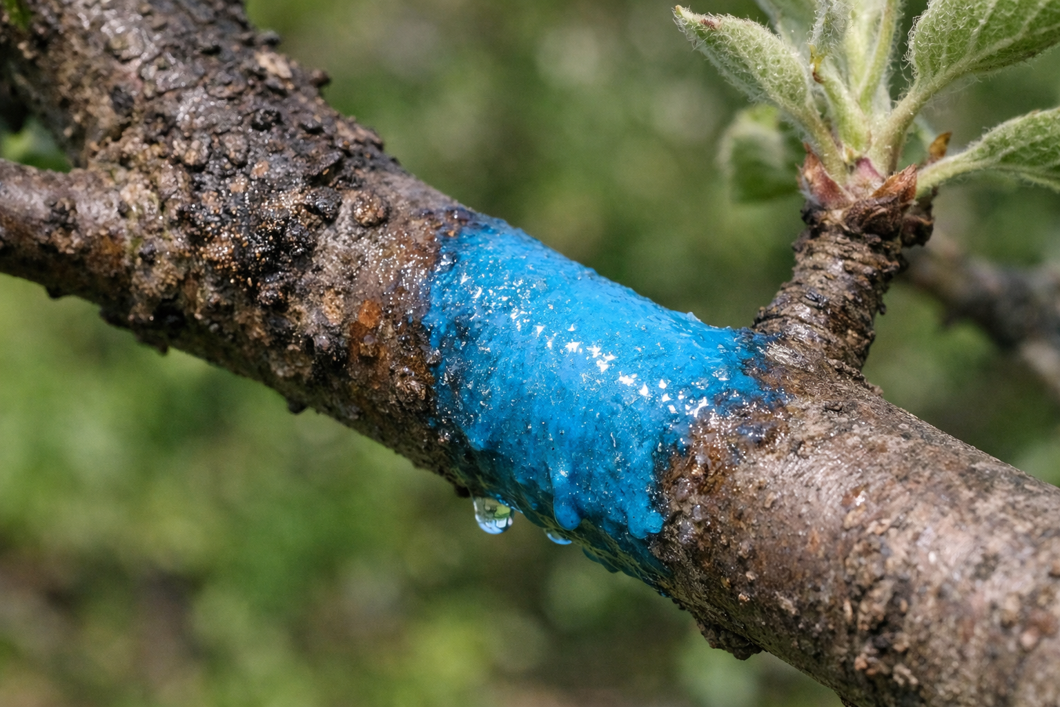Sveika obelų žievė po pavasarinio gydymo įgauna vos pastebimą melsvą atspalvį.