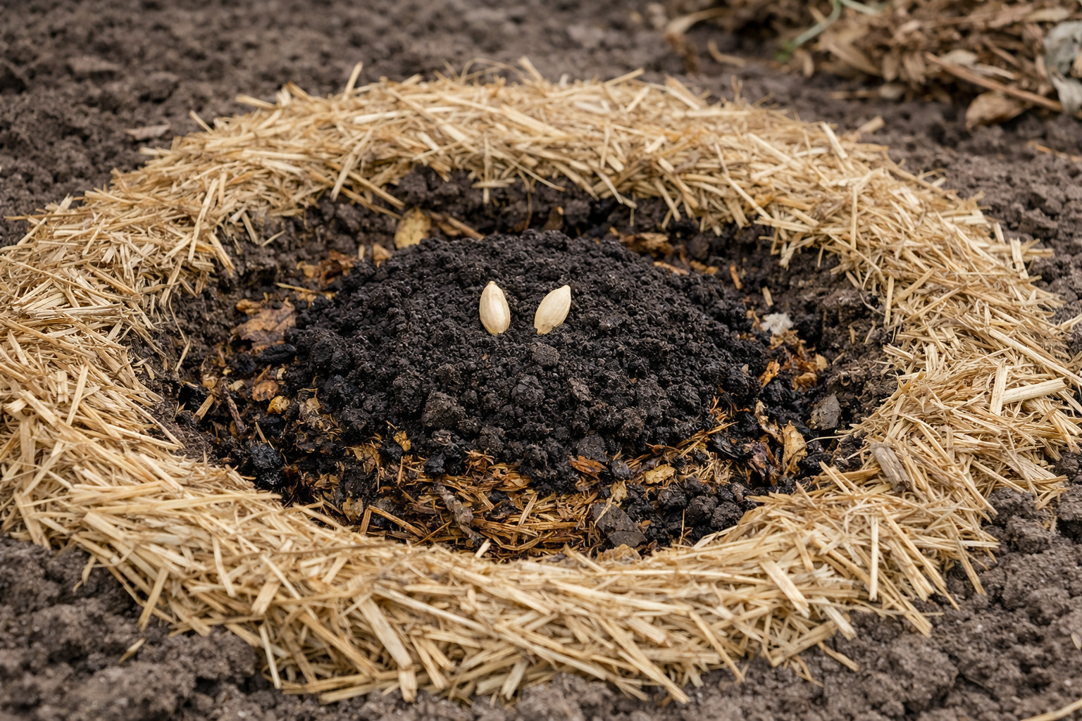 Kad sėklos nesušaltų gegužės mėnesį, naudoju vietinį šildymo būdą. Po kiekviena duobe iškasama 40 cm gylio duobė, kur ji paklojama organika (nupjauta žolė, pernykščiai lapai). Skildamas išskiria šilumą, sukurdamas šildymo efektą iš apačios.