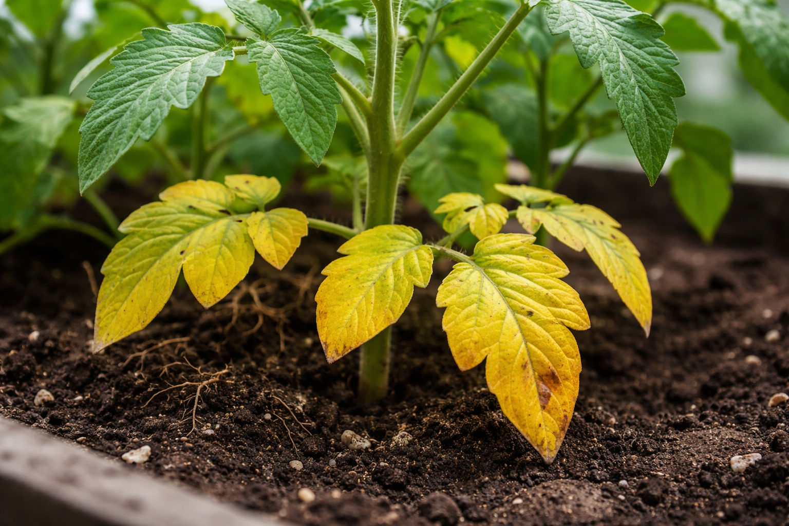 Kai pomidorui trūksta mitybos, jis įjungia išgyvenimo režimą. Augalas perima azoto ir kiti mobilūs elementai iš senų apatinių lapų, kad palaikytų viršūninį augimą. Tai natūralus energijos persiskirstymo procesas, tačiau jei jo nekontroliuosite, prarasite visą krūmą.