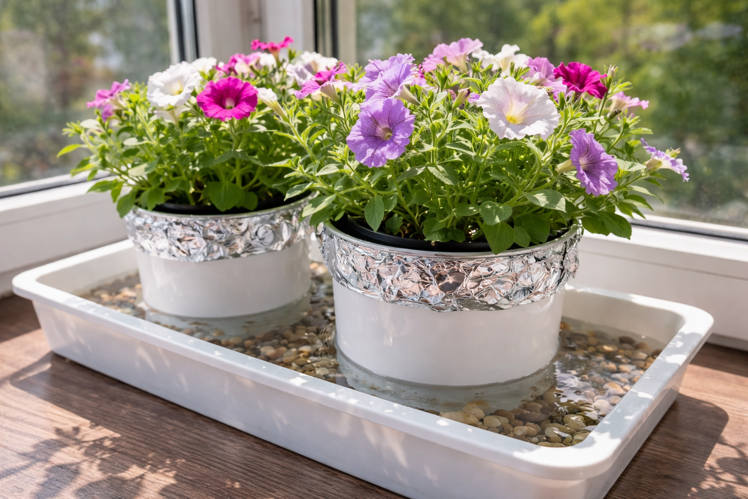 Tinkamos temperatūros sąlygos ir drėgmės kontrolė garantuoja vešlų petunijų žydėjimą visą sezoną.
