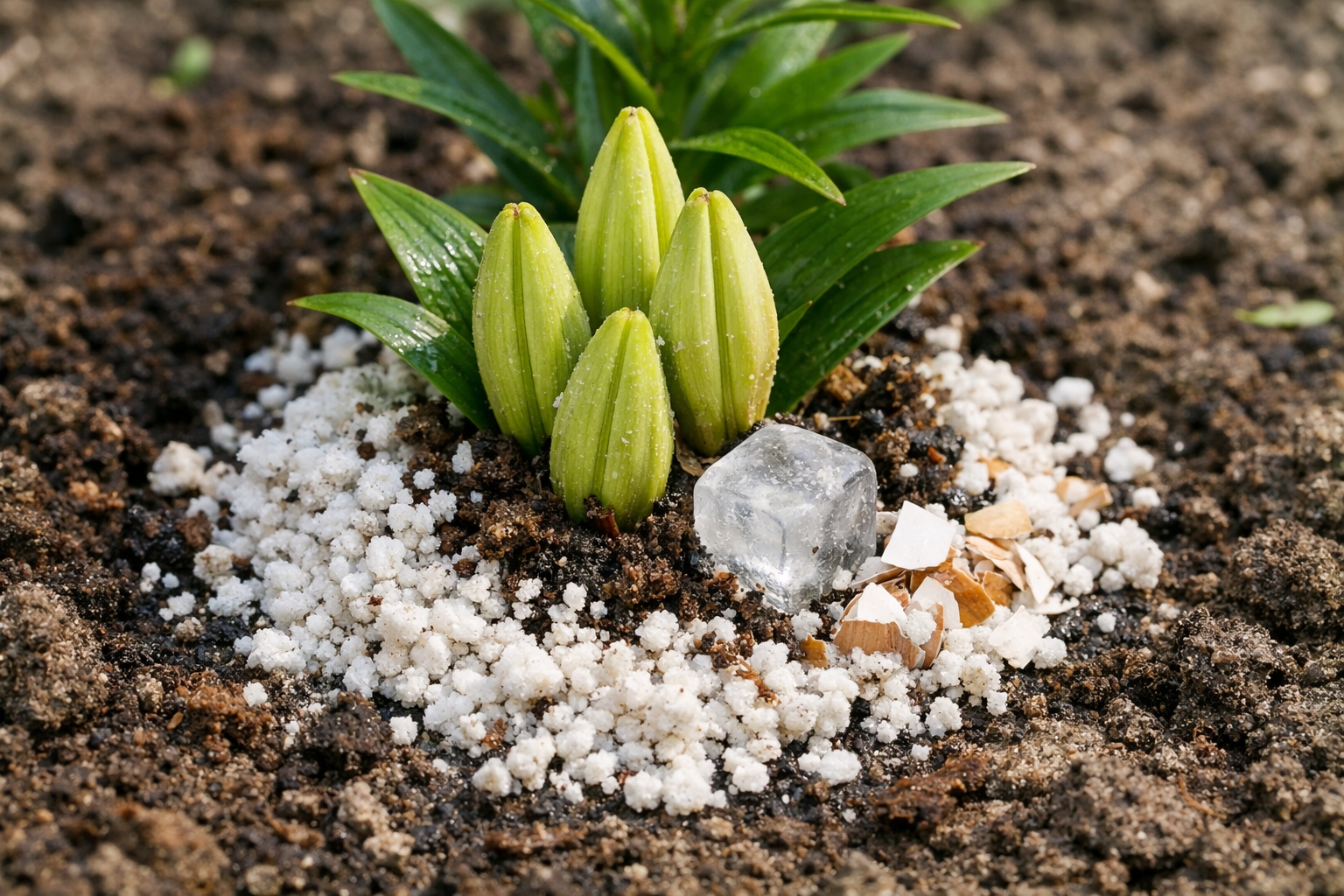 Sodinimo gylis vaidina lemiamą vaidmenį formuojantis žiedkočiai. Jei augalą pastatysite per arti paviršiaus, šaknų sistema akimirksniu išdžius po vasaros saule. Įkasus per giliai, daigai tiesiog neturi pakankamai vidinių atsargų, kad galėtų prasiskverbti pro žemės storį ir išleisti pumpurus.