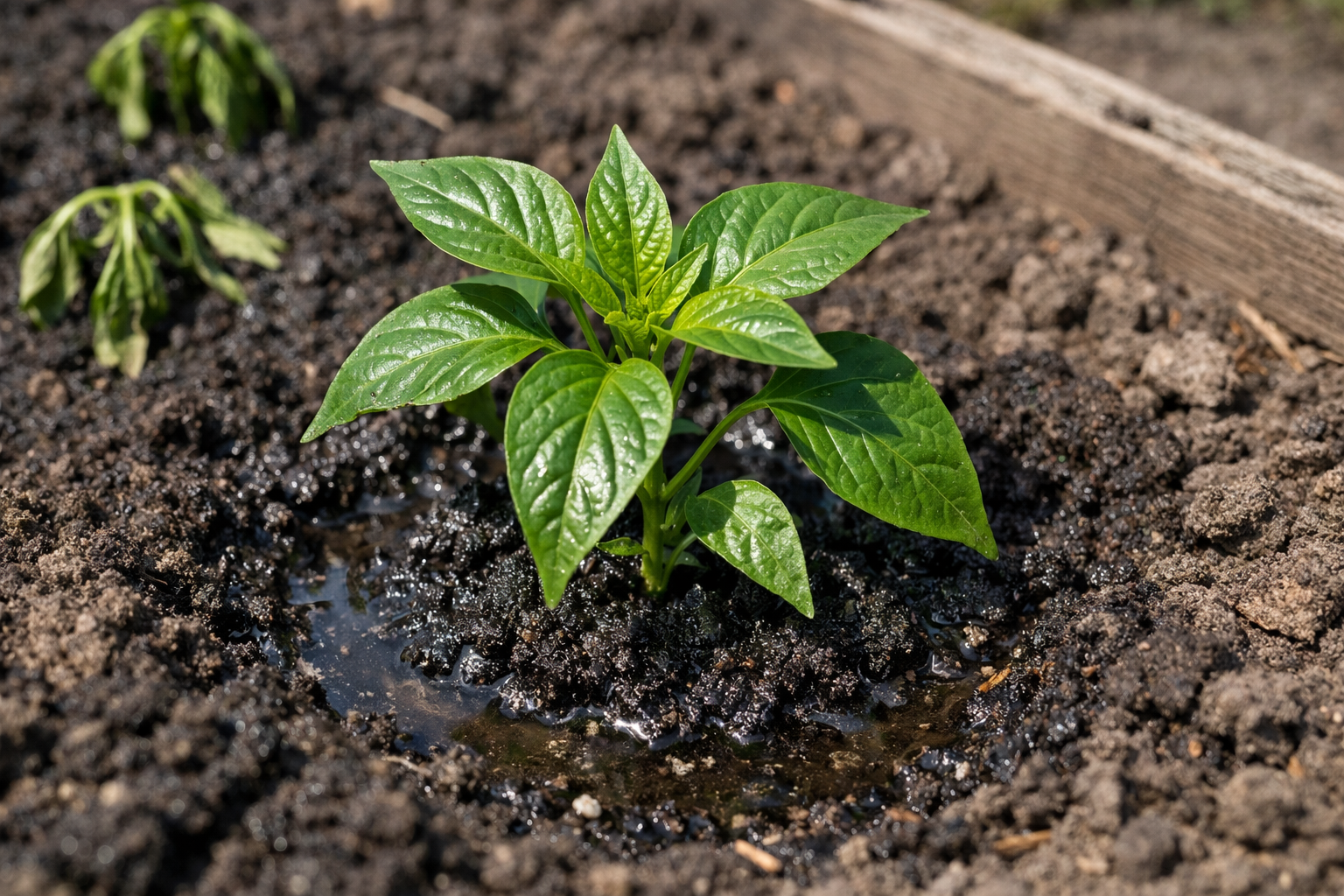 Pagrindinė greito pipirų prisitaikymo paslaptis yra teisinga mulčiavimas lysvės iš karto po persodinimo, o tai leidžia išlaikyti idealų mikroklimatą ir stabilią drėgmę šaknims.