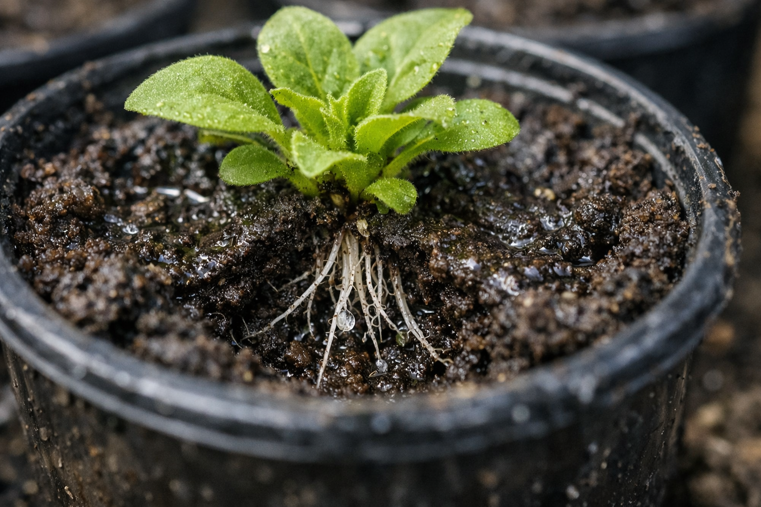 Žemės gumulą reikia tik šiek tiek sudrėkinti per porą valandų, kad jis nesutrupėtų rankose ir nesuplėšytų gležnų šaknų.